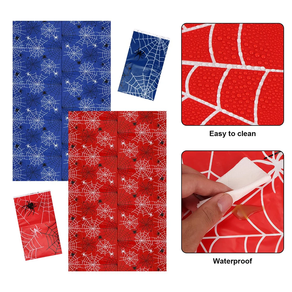 • Includes 4 red and blue tablecloths with cool spider web patterns
