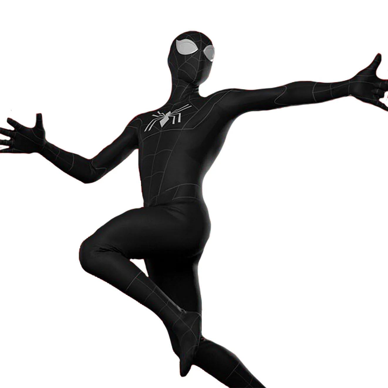 Iconic black bodysuit with contrasting white spider logo and web accents