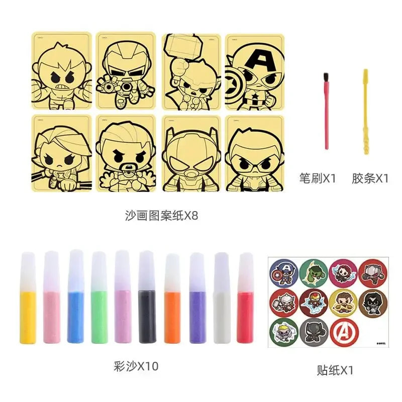 Includes themed sand painting boards featuring Marvel characters like Spider-Man & Captain America