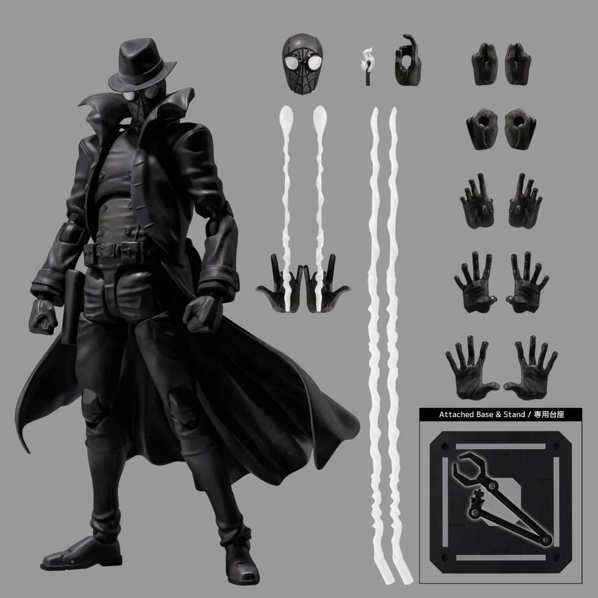 Features Spider-Man Noir in signature black trench coat and fedora