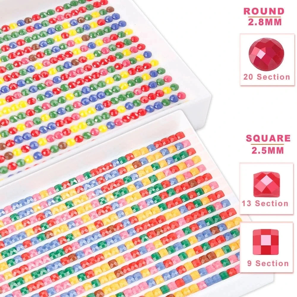 Adhesive-backed canvas, high-quality resin rhinestones, and a full set of diamond painting tools.