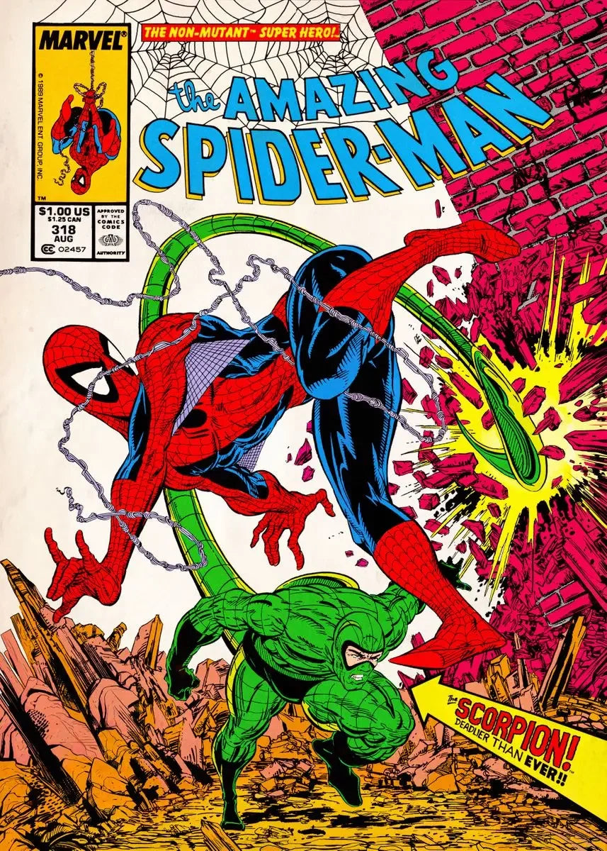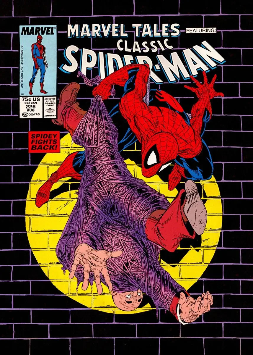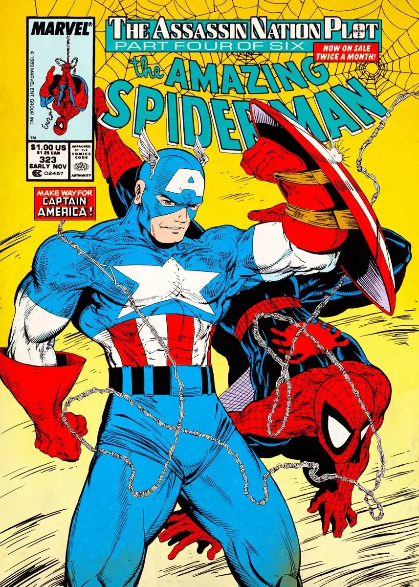 Showcases Spider-Man in colorful comic book style from Marvel’s classic Avengers universe