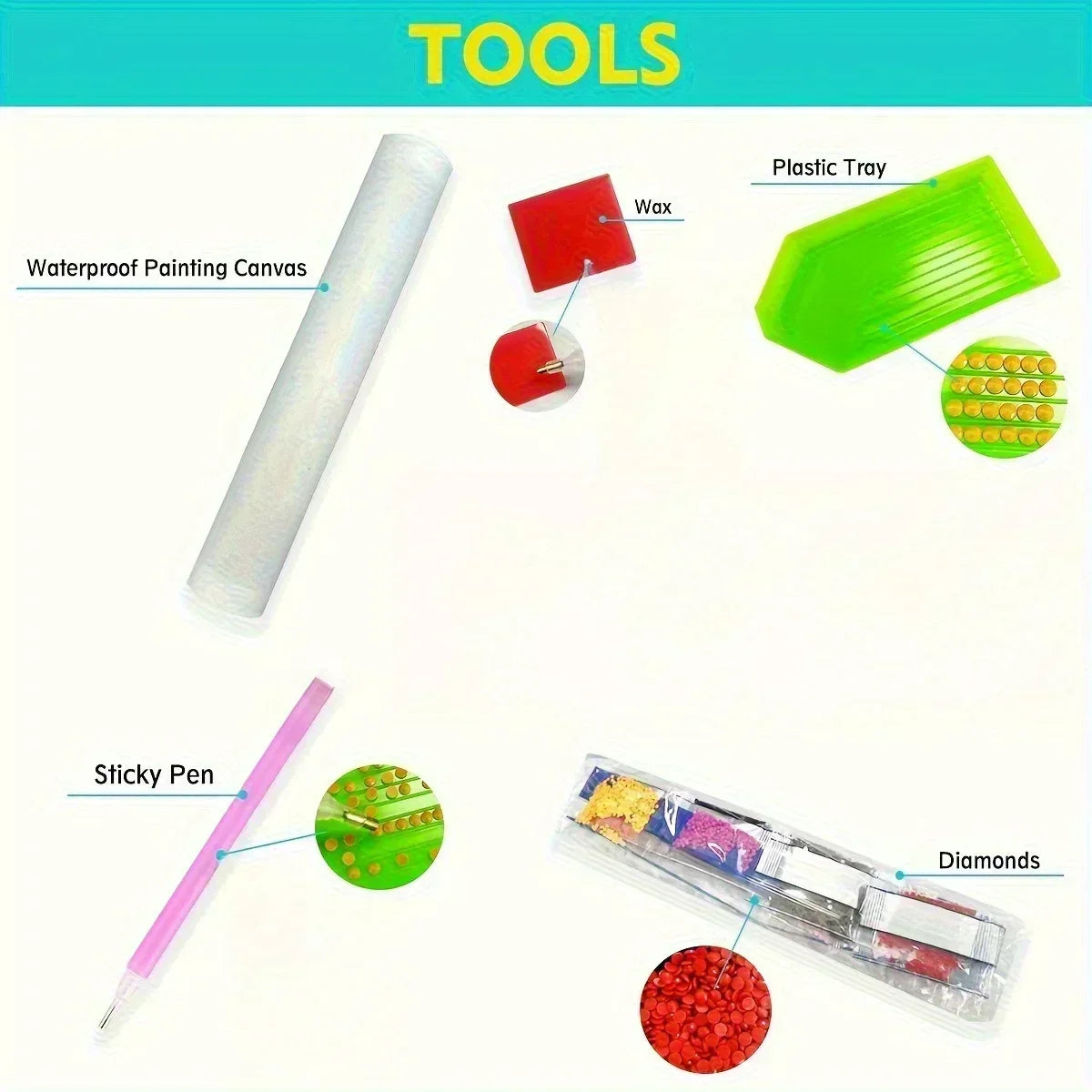 • Includes all tools needed: canvas, resin diamonds, diamond pen, tray, and glue