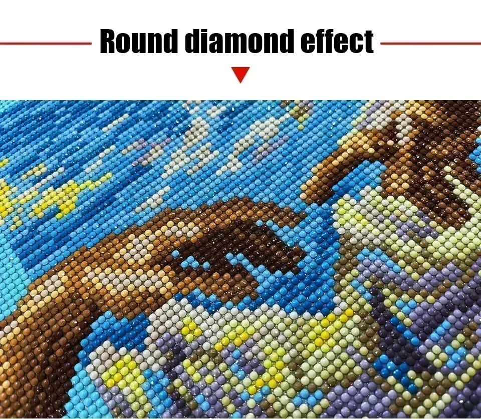 High-quality resin diamonds (round or square) + durable printed canvas with adhesive surface.