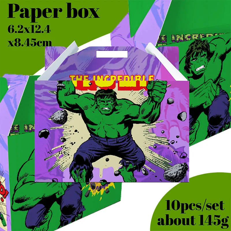 Set includes 10 Hulk-themed paper boxes for treats and party favors