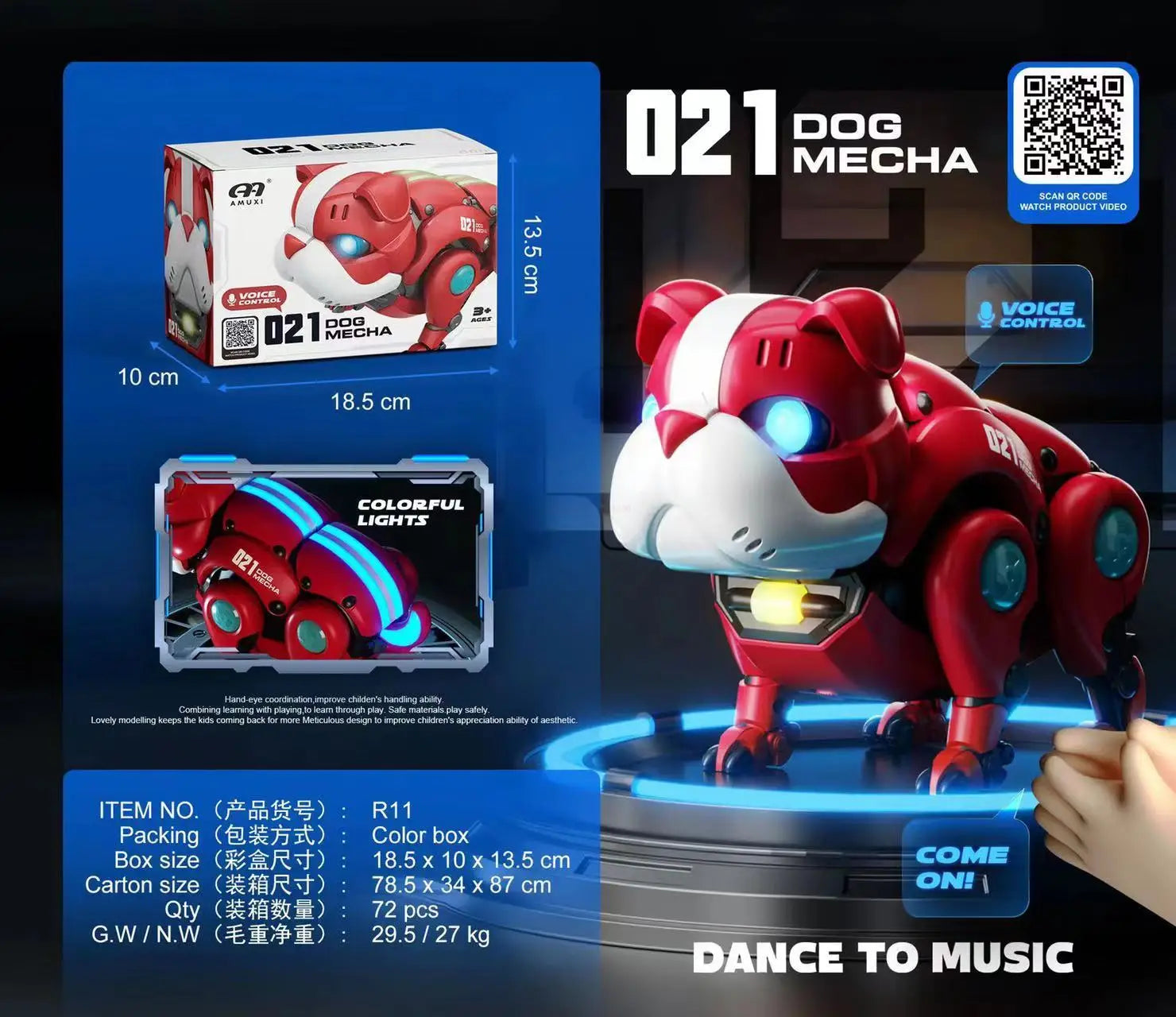 Easy-to-use on/off switch for kids to activate music and dancing